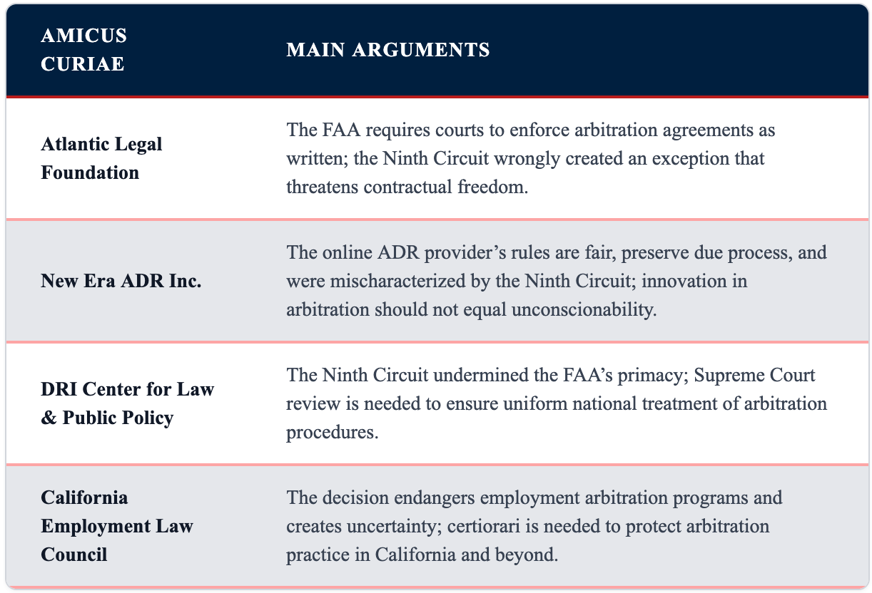 Similar to the Atlantic Legal Foundation, the Council expressed concerns about the use of mass filings to coerce settlements and rejected the idea that the FAA is limited exclusively to bilateral arbitration. “[T]he Ninth Circuit holding that the FAA does not apply to arbitrations other than the traditional bilateral arbitrations,” states the council’s brief urging the Supreme Court grant certiorari, “is in direct contravention of the terms of the statute and the scope of its coverage as interpreted by this Court and threatens countless employers with attempted blackmail via mass arbitration demands.”